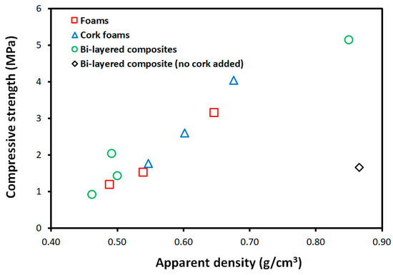 The differences between the various compositions are further illustrated by plotting their compressive strength vs. apparent density, and results are shown in Figure 9. Not surprisingly, the decrease in the specimens’ density, achieved by using a foaming agent, cork or a mixture between them, strongly reduces their compressive strength. The differences between the foams and the cork foams are also clearly illustrated, the cork foams showing higher strength and densities possibly due to their lower porosity caused by the addition of cork.