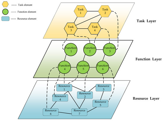 For the task-function-resource hierarchy architecture of the system, from the perspective of the element set, the system’s task element set, function element set, and resource element set can be defined separately. The task element is a task unit established by the system requirement analysis. It is supported by a series of basic function elements. The task element set can be expressed as a set of several task elements: . Similarly, the function element is the basic function unit that supports the task implementation in the system. It is supported by a series of basic resource elements. The function element set can be expressed as a set of several functional elements: . The resource element is a physical or logical unit that supports the realization of function in the system. The system resource element set can be represented as a set of several resource elements: .