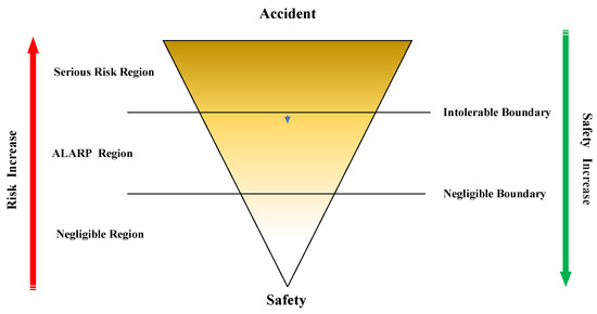 As a project risk criterion generally adopted by domestic and foreign institutions, the principle of ALARP (As Low As Reasonably Practicable) [70,71] sets two risk “boundaries” based on the value of safety risk and related experience: intolerable boundary and negligible boundary [70], meanwhile forming three risk region and level: serious risk region, ALARP region and negligible region, and the top extreme of the principle is “accident”, and the bottom extreme is “safety”. ALARP rule is shown as Figure 4. The values of the regions and boundaries of ALARP principle are all relative, and there is no standard of definition [72,73]. In practice, expert evaluation method considering potential severity, propagation probability, and propagation time can be applied to determine final values of the boundaries [70,74,75]. Meanwhile, alternative values of the boundaries are also obtained. Finally, compared and analyzed results of final values and alternative values of boundaries, final results can be determined. ALARP region means risk value in this region is reasonably acceptable. Therefore, according to the ALARP principle, this paper classifies risk value of each element into different regions, in order to make further research to propose preventive measurements, so as to reduce the risk level and improve system safety.