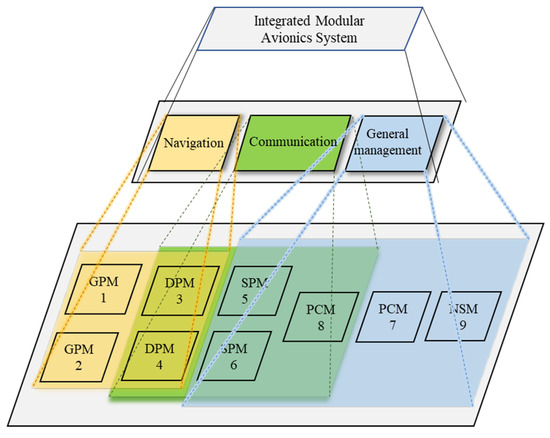 Integrated modular avionics (IMA) [78,79] is a shared set of flexible, reusable, and interoperable hardware and software resources. When integrated, these resources can form a platform that provides service, designed and verified to a defined set of safety and performance requirements, to host applications performing aircraft functions [80]. Based on ASAAC criterion [81], IMA system is managed by a three-layer model: Aircraft Level (AL), Integration Area Level (IAL) and Resource Element Level (REL). This three-level hierarchy of IMA is typical task-function-resource model.