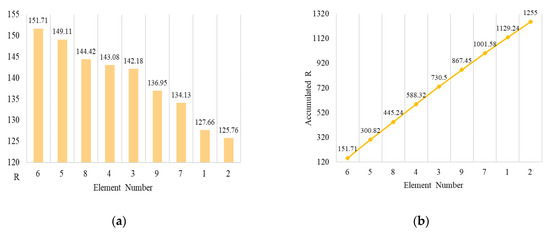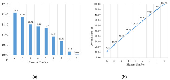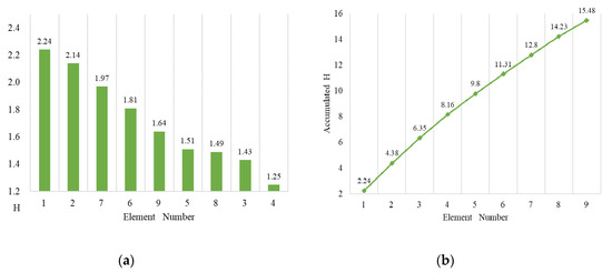 Based on Equation (17), total safety risk entropy of element which effects on the overall system is calculated as shown in Matrix (33). The safety risk entropy of the single element in descending order and the accumulated the safety risk entropy are presented in Figure 9.