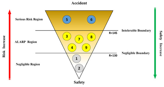 - Based on Figure 8, element 5 and 6 are in the serious risk region; elements 3, 4, 7, 8, and 9 are in the ALARP region; and elements 1 and 2 are in the negligible region.