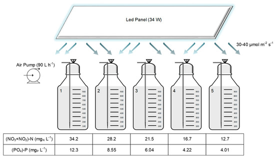 - Silva, N.F.P.; Gonçalves, A.L.; Moreira, F.C.; Silva, T.F.C.V.; Martins, F.G.; Alvim-Ferraz, M.C.M.; Boaventura, R.A.R.; Vilar, V.J.P.; Pires, J.C.M. Towards sustainable microalgal biomass production by phycoremediation of a synthetic wastewater: A kinetic study. Algal Res. 2015, 11, 350–358. [Google Scholar] [CrossRef]
