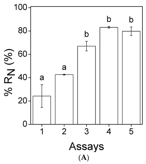 Nitrogen (nitrate + nitrite) removal parameters obtained by C. vulgaris cultures grown in raw and diluted secondary-treated paper industry effluent (assays 1–5): (A) removal efficiency (%RN); (B) average removal rate (RRN); and (C) mass removal (RN). Error bars correspond to the standard deviation of the mean obtained from two independent experiments. Mean values sharing at least one common letter (shown above the bars) are not statistically different (p > 0.05).