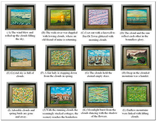 The dependent variables in this study are presented in the questionnaire on the participants’ experience. The first part is the basic information, including gender, age, and latest academic title; the second part is a questionnaire on the exhibition experience, which had been obtained from the research of Hsieh [41]. The options include “pleasure,” “relaxed,” “calm,” “having access to all the works I like,” “originality,” “attractive,” “precious,” “the works make me feel the form or meaning of cloud,” “the title can intensify my interest in the painting,” “I would like to hang this painting in my house,” and “preference.” Each question was be evaluated with 1 point (strongly disagree), 2 points (disagree), 3 points (fair), 4 points (agree), or 5 points (strongly agree). The third part was to select three favorite paintings from among these twelve and indicate their numbers.
