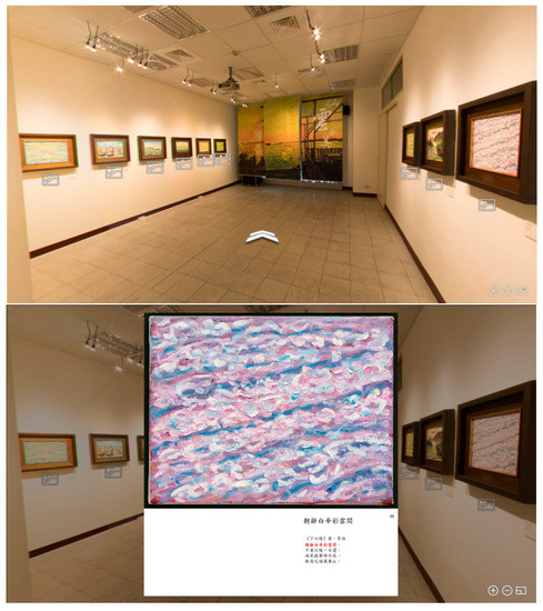 The exhibition was viewed with desktop VR is shown in Figure 3. In this study, panoramic photos were captured with a digital camera, whose center was the spinning axis so that the camera could capture multiple photos of the surroundings. These photos were thereafter processed, including the correction of slant and bent images and image stitching, and the light variation among the images was adjusted. Subsequently, a cylindrical panorama was constructed from all the images. This study set three observation points in the exhibition and used multimedia web technology to simulate and display the dynamic panoramic images combined with the web page structure. After logging into this web page, visitors could click the sign of the “white arrow” on the floor and move to that place immediately. They could thereafter move the mouse to change the position of viewing. There was a quadrangle pattern under each painting, which could be clicked with the mouse to present the magnified image and the title of the work, as shown in Figure 3.