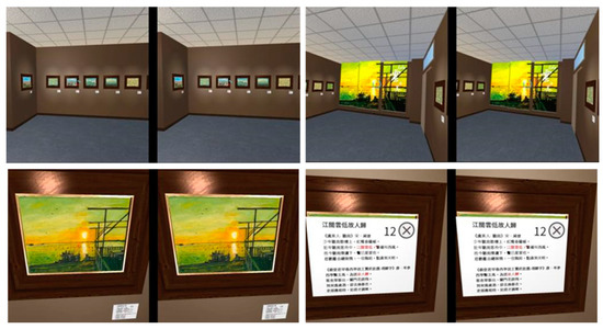 HMD VR is a virtual exhibition area inspired by the decoration of physical exhibitions and constructed with 3Ds Max. After its completion, the electronic files of 12 paintings were inserted and subsequently, the UNITY software integrated the scene and HMD. This was carried out in the form of a mobile application (App). Viewers could download the App and turn it on, and the exhibition was presented on the mobile phone as shown in Figure 4. The mobile phone was thereafter connected to the VR glasses which were mounted on the head. When viewers turned their heads, the image on the mobile phone would rotate simultaneously. This study intended that the subjects would focus on viewing the paintings; therefore, a movement method similar to the point and teleport in the study of Bozgeyikli et al. [25] was used. When there were no obstacles between the motion paths, this movement method was suitable for the VR environment. In this scene, viewers moved with the gaze-point at the middle of the image. When the gaze-point froze on a painting, the mobile phone could zoom into the painting (lower left of Figure 4). When the gaze-point froze on a painting card, it could be zoomed in and presented in the image (lower right of Figure 4). If viewers wanted to close the painting card, they moved the gaze-point to the ⊗ sign on the upper right; otherwise, the card remained as it was.