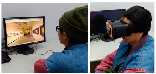 The researchers first explained the experimental purpose and process to the subjects, and then, randomly selected the experimental conditions of the subjects. Each participant only viewed through a single medium to avoid learning effects. Participants either viewed the physical original works in an exhibition room or participated in one of two VR experiments in the office. In the experiment with desktop VR, the participants viewed the works through a 22-inch liquid crystal screen (brand: ASUS; No. VW228) and controlled the direction with a mouse (left of Figure 5). In the experiment with HMD VR, the participants used a mobile phone (brand: ASUS; No. Z017DA) to view the VR content. They wore head-mounted VR glasses (brand: KWorld, No. 3D-VRII) and moved their heads to watch their surroundings (right of Figure 5). This experiment did not set a time limitation for viewing, and hence, the participants could decide how long to spend on appreciating each painting, after which they filled out the questionnaire.