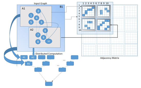 Graphs are abstract models of complex relationships commonly established in current networks. Formally, a graph is a collection of the network’s entities (i.e., vertices, V) and interactions among them (edges, E). Given a graph G, we use the corresponding adjacency matrix A, which indicates whether two vertices of G are connected by an edge, i.e., , if . We also use the notation to denote the sub-matrix of A indexed by the rows and columns . Moreover, we denote by the subgraph of G induced by the subset of vertices .