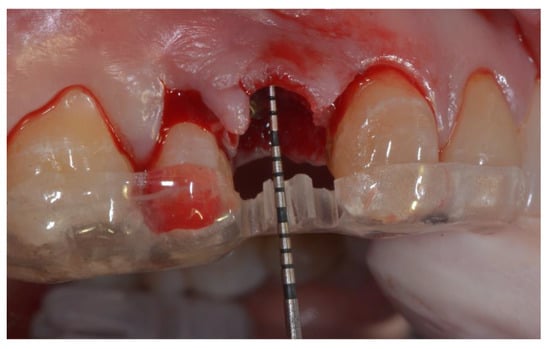 All patients rinsed for one minute with chlorhexidine mouthwash 0.2% before the surgery (and two times a day for the following three weeks). Under local anesthesia using lidocaine (adrenaline 1:50,000), patients were operated with the same surgical approach consisting of minimally invasive tooth extraction, without raising a muco-periosteal flap. Great attention was taken to reduce the damage to the vestibular bone plate and to maintain the integrity of the alveolar bone morphology. The extraction sockets were thoroughly debrided to remove all soft tissue, subsequently, the acrylic custom-made template was used to take the horizontal and vertical bone measurements. The surgical template was stabilized on the adjacent teeth to allow reproducible horizontal and vertical measurements at the different time points of the study. The vertical measurements were performed taking the surgical stent as reference point, as shown in Figure 1.