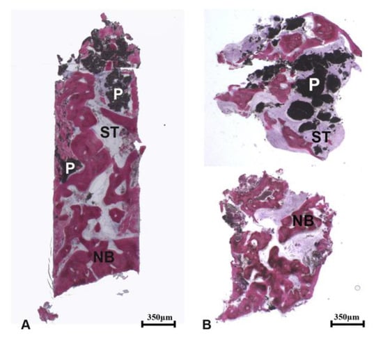 (A,B) Light microscopic ground sections of the specimens showed two-dimensional histological micro-structure of bone biopsies composed of regularly organized newly formed trabecular bone (NB), soft tissues (ST), and residual biomaterial particles (P) (acid fuchsin–toluidine blue, 12X).