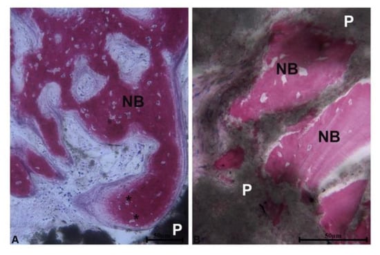 (A) Histological image showing newly formed bone (NB), osteocytes within with large osteocytes lacunae (*) (typical of newly formed bone), and residual biomaterial particles (P) (acid fuchsin–toluidine blue, 100X). (B) Histological image showing residual biomaterial particles (P) and newly formed bone (NB). Woven bone showed high affinity for dyes and was acid fuchsin positive, and therefore, highly stained tissue was observed next to the grafted material particle (acid fuchsin–toluidine blue, 100 and 200X).