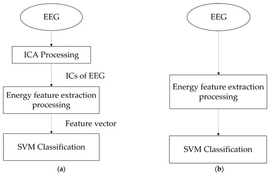 In Method 3, as shown in Figure 7a, the OAs are removed from ICs of EEG using the ADJUST algorithm after the ICA process [40]. The ADJUST is a completely automatic algorithm that can identify artifact-related independent components by combining the artifact-specific spatial and temporal features. The ICs without OAs are directly extracted energy features, and then they are the input vectors for the SVM classifier.