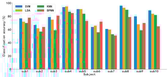 Method 1 presented in this paper uses the SVM classifier algorithm. In this section, we further discussion the influence of different classifier algorithms on the classification accuracy. The LDA, BPNN, and KNN classifiers are used in Method 1, separately, in order to compare with the SVM classifier. The classification accuracies of LDA, BPNN, KNN, and SVM are shown in Figure 9.