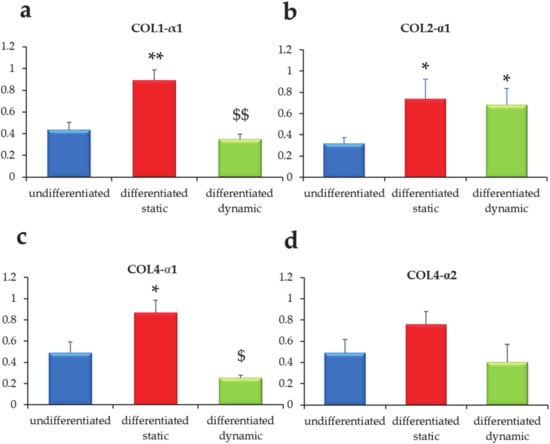 Collagen gene expression analysis performed on hMSC/*PCL constructs for the following genes: (a) Col1-α1; (b) Col2-α; (c) Col4-α1; and (d) Col4-α2: (a–d) Statistical significance: * = p < 0.05; ** = p < 0.01 vs undifferentiated; $ = p < 0.05; $$ = p < 0.01 vs differentiated statically cultured hMSC/*PCL constructs.