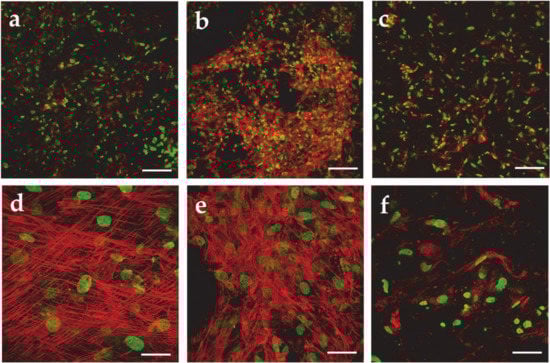 Confocal laser scanning microscopy (CLSM) analysis on hMSC/*PCL constructs how cell nuclei imaged in green and f-actin in red: (a,d) differentiated in static conditions; (b,e) differentiated in dynamic conditions; (c,f) undifferentiated. (a–c) Scale bar = 100 µm, original Magnification 200×; (d–f) Scale bar = 30 µm, original magnification 600×.