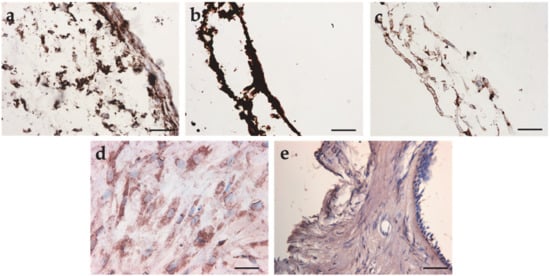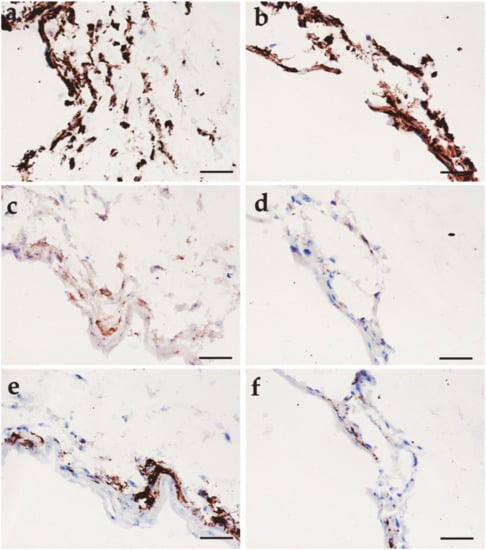 Fibroblast surface marker resulted expressed in all the constructs, being in the differentiated ones more intensely expressed than in the undifferentiated counterpart (Figure 4). Moreover, in the constructs cultured under dynamic conditions, the fibroblast surface marker expression level was the highest one (Figure 4a–c). The expression level of this antigen in undifferentiated hMSCs cultured in chamber slides was present and comparable to the immunopositivity of the undifferentiated constructs (Figure 4d). The immunopositivity in native TMs was localized only in some areas of the ECM (Figure 4e) and was comparable to that of the undifferentiated statically cultured construct (Figure 4c).