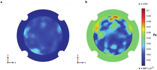 Comparison of von Mises stress map experienced by hMSCs on nanohydroxyapatite (HA)/*PCL (a) and *PCL (b) scaffolds in the TM bioreactor during the culture at 1.0 s from the start position (t = 0 s).