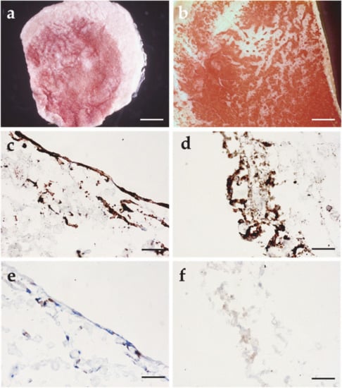 Neutral red assay and immunohistochemical analysis to detect fibroblast surface marker and collage type II on hMSC/HA/*PCL constructs: (a,c,e) statically differentiated; and, (b,d,f) dynamically differentiated. (a,b) Neutral red assay; viable cells are in red; (c–f) immunohistochemical analysis for: (c,d) fibroblast surface marker; and (e,f) collagen type II. Scale bars: (a,b) 1.2 mm; (c–f) 50 µm and original magnification 400×.