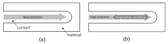 A different attempt to solve the conflict between productivity and quality is beam oscillation as dynamic beam shaping method. That implies a superimposed modification of the laser beam movement regarding the feed direction. Thus, the beam oscillates inside the generated cut kerf and thereby shapes the interaction area into an arbitrary geometry [30,31]. A main advantage of beam oscillation concept is the preserved intensity distribution of the fiber laser beam at simultaneously increased interaction area between laser beam and melt. Two of the most relevant processes using beam oscillation are electron [33,34] and laser beam welding [35,36,37,38]. In addition, first investigations on laser beam flame cutting of mild steel [39,40,41] and LBFC of stainless steel [2,30,31] have been performed with beam oscillation. All these investigations have demonstrated a high potential of process improvements regarding less process instabilities, faster processing speed, and advanced quality.