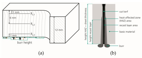 The cut samples were analyzed regarding burr, surface roughness, HAZ, and recast layer. The single methods are described in the following and illustrated in Figure 2.