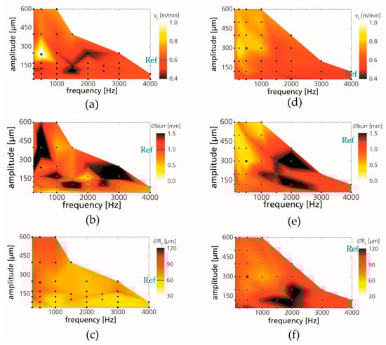 Figure 3 depicts different effects of the used beam oscillation parameters on the cutting process for stainless and mild steel. For example, the beam oscillation improves cutting speed and burr formation of stainless steel at single amplitude-frequency-combinations Figure 3a,b. Whereas, cutting speed and burr changes continuously with increasing amplitude and frequency in case of mild steel (Figure 3d,e). A steady development of the surface roughness in dependence of the oscillation parameters is obvious for both steels (Figure 3c,f). In addition, the three characteristics improve, compared to their reference values for both steels. Similar oscillation parameter achieves a faster cutting speed for both steels. However, the oscillation parameters for reaching low burr height and small surface roughness are not identical for the two investigated materials.