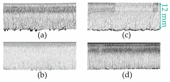 Cut edges of 12 mm stainless steel (a and b) and 12 mm mild steel (c and d) with static beam shaping (a and c are references) and longitudinal, linear beam oscillation (b and d) with the oscillation parameters marked as star in Figure 3.