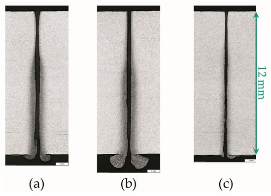 Microscopically images of polished and etched cross-sections of 12 mm laser beam fusion cut mild steel using different oscillation parameters: (a) 60 µm amplitude and 250 Hz frequency; (b) 60 µm amplitude and 4000 Hz frequency; (c) 500 µm amplitude and 250 Hz frequency.