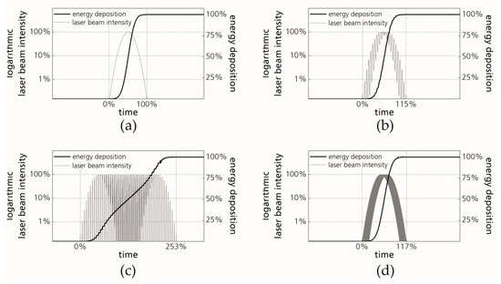 Schematic comparison of the local intensity profile and energy deposition for one certain material position along the cut path as function of the time for: (a) Static laser beam shaping; and different values of the longitudinal, linear beam oscillation parameters: (b) 60 µm amplitude and 250 Hz frequency; (c) 500 µm amplitude and 250 Hz frequency; (d) 60 µm amplitude and 4000 Hz frequency. All axes of the four charts are scaled equally. Cutting speed and focal plane are constant and heat conduction and melt ejection have been disregard.