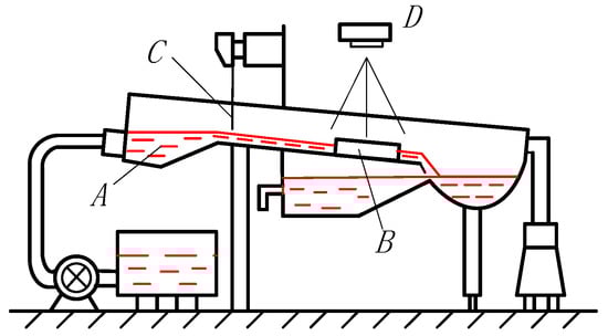 Eugene studied the cutting process from the aspect of fluid flow, and designed an experimental apparatus to model the cutting process as the flow of a fluid around the tool tip [] (Figure 1). Fluid is pumped into place A and flows past tools with different rake angles at B. Powdered bakelite is introduced at C to make the streamlines visible, and photographs are taken by the camera at D. El-zahry [] used Bingham liquid to model the plastic flow between the chip and rake face and study the friction of the second shearing zone. Kwon [] presented a potential flow analysis approach in ultra-precision machining to predict the contact length and cutting forces. Müller [] believes that the cutting fluid melt layer between the chip and the cutting edge induces the chip to easily flow, thereby decreasing the high-speed cutting force. The strain rate is very high during metal cutting, and the relationship between the shear stress and shear strain rate appears to be linear under high strain rate conditions because of the fluid characteristics [,]. According to this linear relationship, Kazban [,] modeled high-speed machining according to the potential flow problem of one source and two sinks; he considered the high-speed cutting process as a simple closed polygonal boundary flow and transformed the process into fluid flow issues. Some metals exhibit similar characteristics to fluids at room temperature. Sundaram [] used a hard steel wedge plow to cut a copper surface and studied the sliding of the metal interface. The surface slip of copper showed laminar flow, and folding and laminar flow interruption occurred. Full-scale sinuous flow simulations were used by Vandana [] to study metal cutting; he finds that folding and sinuous flow can occur even at a low friction and at very low cutting speeds. However, the reason why the relationship between the shear stress and shear strain rate is linear under high strain-rate conditions is unknown and must be studied with respect to the microscopic control mechanism of plastic deformation; this paper answers this question through dislocation motion analysis. Based on this theory, the strain-rate distribution in the cutting process is studied from the perspective of fluid flow by means of simulation and experimental verification, so as to provide new ideas for the research of the cutting process.