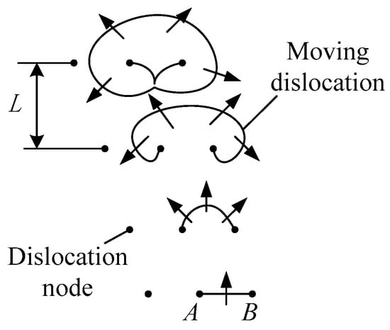 Dislocations can be multiplied through several mechanisms. According to the dislocation mechanism of the Frank–Read source (Figure 2), the dislocation line AB is pinned by dislocation nodes at both ends. The time needed to remove the node constraint is , and the time spent by moving dislocation between the adjacent dislocation node is . When the dislocation moves to the obstacle under applied stress, the dislocation will be successfully transformed to the other side of the obstacle by a certain frequency due to the influence of heat. The transition frequency is