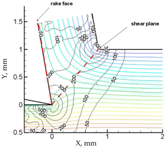 Solving the two equations can provide results that include the strain-rate distribution (Figure 3). The numbers marked in the figure are ordinal numbers arranged according to their true values, and the real value needs to be multiplied by 103. The strain rate value in first deformation is the largest and gradually decreases from the center (shear plane) to the exterior. Additional details are presented in previous studies [,,]. Although additional models can be established from the fluid-flow aspect, studying the metal cutting process is a new direction.