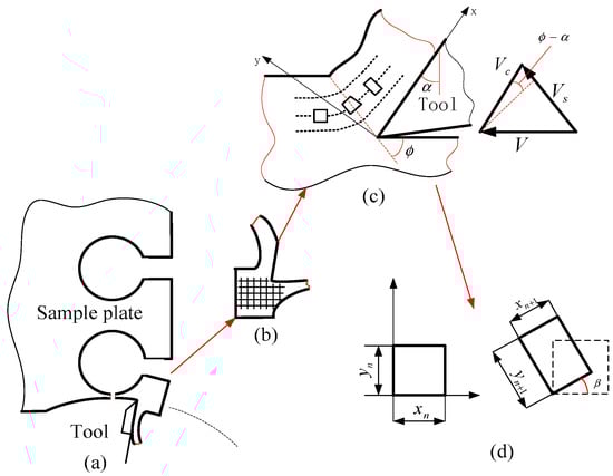 First, tiny meshes are created on the surface of the workpiece, which has many small holes on the edge (Figure 4a). The chip root can be easily acquired because of the structure of the hole. As the milling feed increases, the material near the cutting tool side decreases until the chip root is separated from the workpiece due to the tool feed (Figure 4b). In the cutting process, the mesh will be distorted after flowing through the shear plane (Figure 4c), where V is the cutting velocity, Vc is the chip velocity along the direction of the rake face, Vs is the chip slip velocity along the direction of the shear plane, is the rake angle and is the shear angle. X is set as the direction along the cutting tool rake face direction, and Y is the direction along the vertical tool rake face direction. Assuming that the grid with a side length of moves Lx distance after tx time, becoming with a deflected angle (Figure 4d), the strain along the X direction can be obtained: