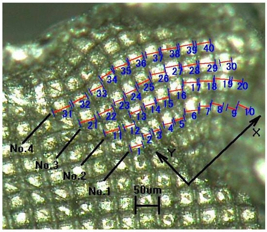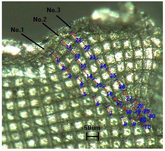 The chip root with deformed meshes is indicated in Figure 5 and Figure 6. Four streamlines are selected along the rake face direction, and the lengths of 10 meshes on each streamline are marked as 1–40 (Figure 5). Three shear lines are taken along the shear plane direction, and 10 meshes are obtained from each shear line for measurement. These meshes are marked as 1–30 (Figure 6). The length of each primitive grid in the two directions is shown in Table 1 and Table 2.