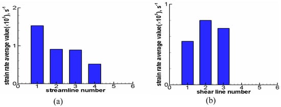 The strain rate distribution on each line can be calculated using Formulas (13) and (14). A single numerical value fluctuates greatly due to the influence of the front and rear grids; thus, studying the strain rate of a single grid is meaningless. The average values of each line are close to the actual distribution. The calculation results are shown in Figure 7. The average strain rates of the streamline on the rake face are 1.53 × 105, 0.91 × 105, 0.89 × 105 and 0.52 × 105 s−1. The average strain rates of the shear line on the shear plane direction are 0.54×105, 0.80×105 and 0.70 × 105 s−1, respectively. As shown in Figure 7a, the farther away from the rake face, the smaller the value will be because of the friction between the rake face and chip; the greater the friction, the greater the deformation and the higher the average strain rate will be. Figure 7b shows that the average strain rate on the second shear line is the largest because it is located at the center of the first deformation zone, and the other regions decrease in turn; this finding is similar to the calculation and simulation results [,].