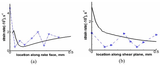 Strain rates obtained from calculations and experiments (dotted lines are the experiment results, and solid lines are the calculated results): (a) Comparison of the strain rate distribution on the rake face; (b) comparison of the strain rate distribution on the shear plane.