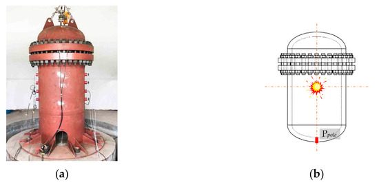The explosion containment vessel and the measures used in this experiment are shown in Figure 1a. The total length L of the vessel was 166.4 cm, the thickness 2δ of the vessel wall was 2.2 cm, the inner major axis diameter Da of the ellipsoidal end cover was 80 cm, the inner minor axis diameter Db was 40 cm and the aspect ratio (L-4δ)/(Da) was 2.025. The internal shape of the upper end cover of the container and the ellipsoidal container bottom were the same. Therefore, a pressure-measuring point Ppole was set at the bottom of the container, as shown in Figure 1b. When the spherical charge was detonated in the center of the container, its pressure curve should have been the same as that of the upper end of the container. Four kinds of compressed TNT spherical charges with 27 g, 65 g, 106 g and 155 g were set, with a density of 1.50 g·cm−3. The TNT charge ball was hoisted in the center of the container and the central detonation method was adopted.