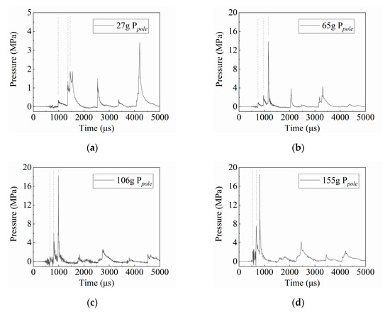 Time history curves of the pressure loading at poles of the different TNT charges: (a) 27 g; (b) 65 g; (c) 106 g and (d) 155 g. The dotted lines indicate the three peaks of the initial pressure stage.