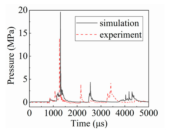 Figure 4 shows the explosion pressure curve of a 65 g TNT charge in the containment vessel with an aspect ratio of 2.025. The scaled distance between this charge and the pole was 2.01 m·kg−1/3. The numerical simulation and experimental results were well matched and the maximum pressure was reached at the third peak.