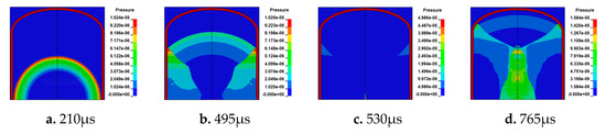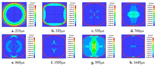 Observing Figure 2, it can be found that with a small amount of charge, the interval time between the convergence wave peak and the secondary shock wave peak is smaller, as shown in Figure 2a. To investigate this phenomenon, an explosion containment vessel model with a same aspect ratio of 2.025 and a smaller charge of 8 g was used for numerical simulation. In conversion, the scaled distance between the charge and the pole was 4.05 m·kg−1/3. Figure 6 shows the pressure nephogram at the critical moment.