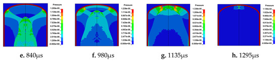 Figure 5 illustrates the nephogram of the internal explosion in the container under this working condition. After the charge explosion at 0 μs, the explosion shock wave reached the vicinity of the vessel wall at about 210 μs, and then because of the blocking effect of the wall being moved along the vessel wall towards the bottom, the shock wave formed the reflection shock wave. At about 495 μs, a clear Mach reflection and a three-wave intersection phenomenon appeared. It is worth noting that the reflection waves at the detonation center torus were gradually converging toward the center of the container. At 530 μs, the reflection shock waves from the torus successfully converged at the center of the container and generated the secondary shock wave that propagated to all directions of the container. At the same time, the Mach wave continued to propagate along the end cover inner wall after passing the corner between the barrel and the end cover, as shown at 765 μs (Figure 5d). At around 840 μs, the first explosion shock wave had already acted on the end cover, and the first pressure peak appeared at the pole of the end cover, as shown in Figure 4 and Figure 5, respectively. The secondary shock wave propagated faster in the air after the primary explosion wave was compressed, while the Mach wave propagated slower due to the wall retardation. Therefore, before the Mach wave at 1135 μs, the secondary shock wave reached the end cover pole, forming the second pressure peak. At the following moment 1295 μs, Mach reflection waves from all directions converged and collided at the pole of the end cover, creating a third pressure jump. Over time, the new shock wave formed at the pole and travelled around.