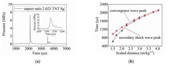 In order to explore the changing law of the interval time between the convergence wave and the secondary shock wave at different scaled distances, the charge was set between 8 g to 155 g, and the corresponding scaled distance ranged from 1.51–4.05 m·kg−1/3. The simulation results are shown in Figure 7b. When the scaled distance was small, the interval time between the convergence wave and the secondary shock wave was large, therefore three dominating peaks at the initial stage could be observed in the pressure curve, and the maximum value appeared in the third peak—the convergence wave peak. As the scaled distance grew, the interval between the convergence wave and the secondary shock wave decreased gradually, until the convergence wave was superimposed on the secondary shock wave. When the scaled distance reached 4.05 m·kg−1/3, there were only two obvious wave peaks in the pressure curve and the maximum pressure appeared on the second peak—the superimposed wave peak.