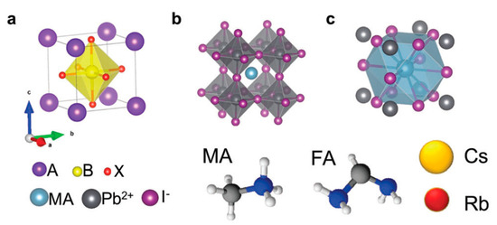 Representation of the typical components of lead perovskites and the typical perovskite crystal structure, viewed in three different ways. ABX3 with A components being methylammonium (MA), formamidinium (FA) or Cs(I) or Rb(I), the B = Pb(II). The X can be iodide (I−), bromide or chloride. Note that the octahedral coordination around Pb(II) can be displayed centrally (a) or the MA can be shown centrally (b). In (c) the square unit cell is shown with MA in the center. Reproduced (and adapted) with permission from Energy Environ. Sci. 2017, 10(3), 710–727, Reference [2].