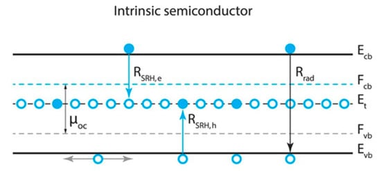 Electron and hole energetics and recombination. The free energy µoc of photogenerated electron-hole pairs at the open circuit (oc) is equal to the energy splitting of the quasi-Fermi level conduction (Fcb) and valence (Fvb) bands. The trap level (Et) in the mid-gap is empty from where Shockley-Read-Hall recombination of electrons (holes), RSRH,e (RSRH,h), occurs. Reproduced with permission from Sci. Rep. 2017, 7, 44629. Reference [6].