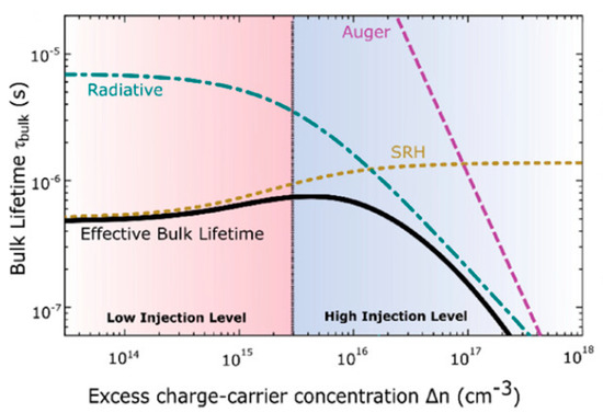 Relation between the charge carrier concentration, ∆n, and the different contributions to charge recombination. At low charge densities the effective bulk lifetime is mainly determined by the Shockley–Read–Hall (SRH) recombination. At higher levels, radiative charge recombination determines the bulk lifetime for p-type MAPbI3. Reproduced with permission from Adv. Mater. 2019, 31, 1900428. Reference [3].