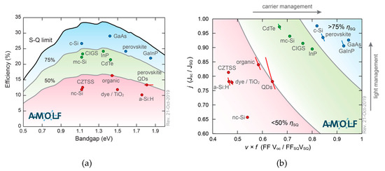 The Shockley–Queisser limit is useful to compare existing and novel photovoltaic technologies and their performances. Figure 4a shows the record-efficiency cells for various materials plotted against their band gap, together with their regions, expresses as a percentage of the S-Q limit (in red [below 50%], in green [between 50% and 75%] and in blue [>75%]). Most photovoltaic materials are currently below 75% of their theoretical maximum efficiency while perovskite technology, with a record efficiency of 25.2%, is starting to compete with commercialized technologies like c-Si (26.7%) [1,10,11]. GaAs clearly still is highest in the graph. Figure 4b shows that light management (which influences JSC /JSQ) is relatively good in perovskite, meaning that current losses are low (93% of the maximum current for that band gap). The carrier management, the ratio of the FF × VOC to their theoretical maximum (FFSQ × VSQ), is lower (0.80) for perovskites. Thus, in order to engineer perovskite towards the ultimate power conversion efficiency, optimization of the voltage (which is influenced by charge carrier management) is of great importance.