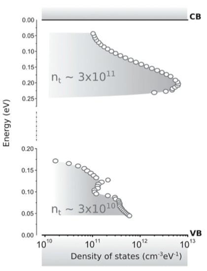 Density of the trap states (with their energetic distribution) within the band gap, extracted from the temperature-dependent properties. The valence band has less traps, with a slightly smaller energy distribution. Reproduced with permission from Adv. Mater. 2016, 28, 3406–3410. Reference [12].