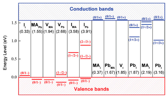 Calculated transition energy levels of various types of point defects in MAPbI3 (interstitials (i), ion substitutions and vacancies (V) are indicated). The formation energies of neutral defects are shown in parentheses. The acceptors (red, trapping electrons) and donors (blue, trapping holes) are ordered by the formation energies (from left to right). Reproduced with permission from Adv. Mater. 2014, 26, 4653–4658. Reference [17].