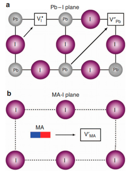 - Kim, J.; Lee, S.-H.; Lee, J.H.; Hong, K.-H. The Role of Intrinsic Defects in Methylammonium Lead Iodide Perovskite. J. Phys. Chem. Lett. 2014, 5, 1312–1317. [Google Scholar] [CrossRef]