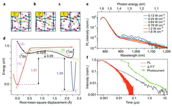 Interstitial iodine defects as hole and electron traps in MAPbI3. Local geometrical structures of interstitial iodine (a) as a cation I+, (b) as a neutral atom, I, and (c) as iodide, I−. (d) Potential energy landscapes related to species in (a), (b) and (c). Root mean square displacement of iodine atom with respect to the position of Ii+. Dots are calculated points, lines are interpolated. (e) Steady-state photoluminescence (PL) spectra with increasing excitation fluence, showing enhanced near infrared (NIR, ~1000 nm) emission at low excitation powers. (f) Photoluminescence dynamics probed at 1.56 eV, together with photocurrent decay and transient absorption kinetics. Reproduced with permission from Energy Environ. Sci. 2018, 11, 702–713. Reference [22] as well as Reproduced with permission from Energy Environ. Sci. 2016, 9, 3472–3481. Reference [8].